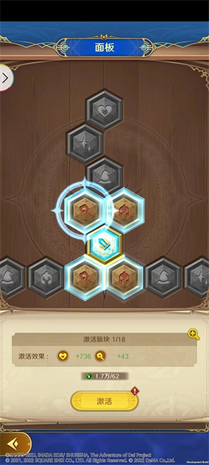战力不够,Buff来凑。勇者们可以通过主界面左下角的悠久之间进入版图界面,激活面板上的板块就可以提升攻击力、防御力、血量等属性啦~
