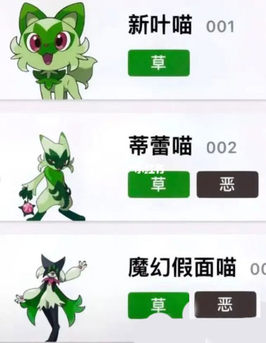 1、进化形态:新叶喵--蒂蕾喵--魔幻假面喵