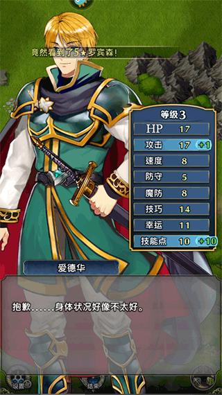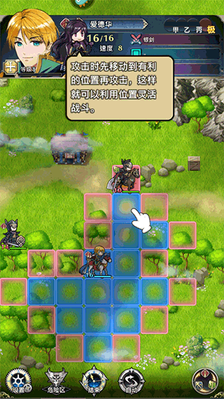 5、地形:战场中的每个单元格都是一个单位,每个单位可以设置不同的地形,地形有一般无影响,障碍(山脉、城墙、河流)完全无法通过,飞行只能飞行通过,回复点(据点)每回合会回血,阻碍需要行动力减少,森林骑马不能进入,有利战斗处于有利状态,破坏物可以破坏后通过的障碍物,传送阵可以传送到其他传送阵,房屋引用可以访问触发NPC对话。