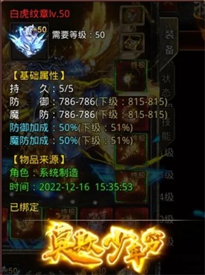 白虎纹章的属性有点多,可以说是一件很有必要升级的一个纹章,首先就是增加基础防御和魔防属性,除此之外还有百分比的防御和魔防加成,可以说是打怪抗伤必备!