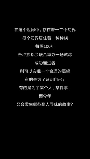 游戏设定的背景是这样的:在这个独特的世界里,一共存在着十二幻界。每个幻界都分别居住着一个种族。每隔百年,各个种族就会联合起来举办一场试炼。只要能够成功通过这场试炼,就可以实现一个合乎情理的愿望。