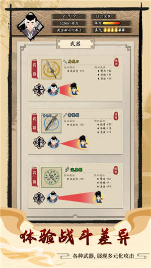 不同武林门派拥有不同武功兵器绝学,善于修炼武功,发挥武器特色,不仅可以弱制敌,也可遇强则强,体验更多元化的攻击方式带来的战斗差异。