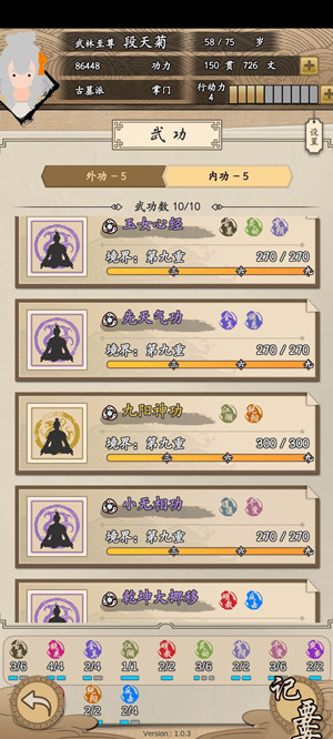 10、主界面左下角图鉴有所有武功详情,以及武功套装效果。类似于自走棋的套路流派。(目前没有试出开荒最优解)