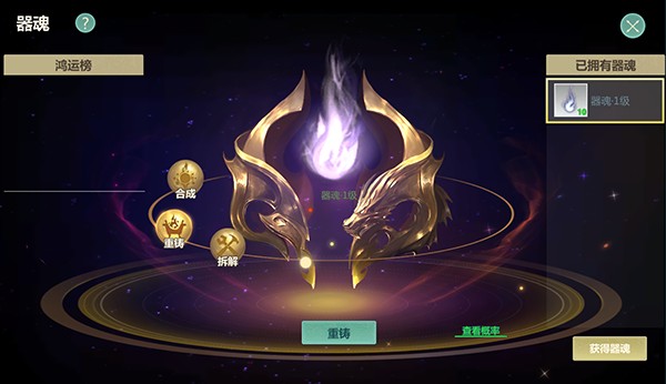2、重铸器魂有55%概率成功,有机会获得等级更高或额外的器,45%重铸失败,器魂碎裂,返还一定的银两。