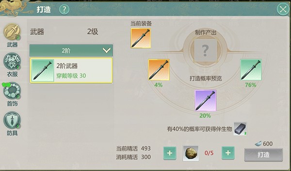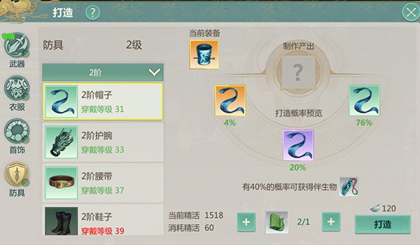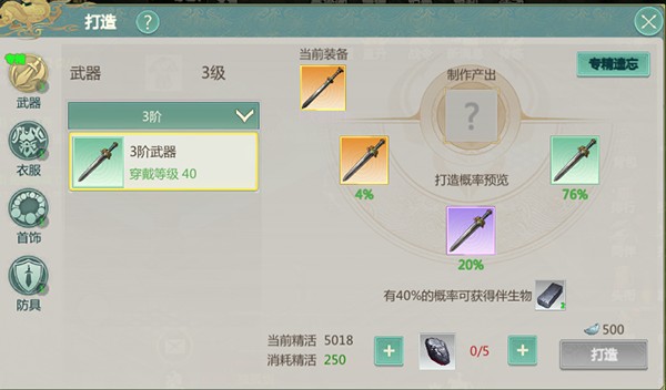 1、装备打造可有概率出现不同品质的装备,同时还有一定概率伴生磨刀石、护甲片、五行石、强身符。