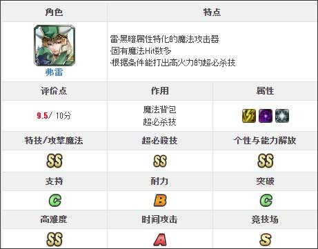 弗雷是能使用雷和黑暗属性魔法的攻击者。专用魔法“重力之力”和“最终切利欧”因为Hit数多,能打出非常高的伤害。