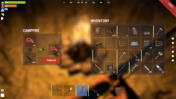 营火堆栏位,底下是燃料木头,上面cook栏位就是放生肉