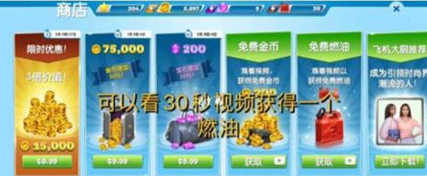 2、就会跳出图二看30秒视频免费获得燃油跟金币,有时候要多刷新几次才会跳出来,如下图所示。