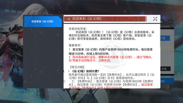 1) 【免费时长】:首次登录《云·幻塔》可获得180分钟【免费时长】。每日登录《云·幻塔》可获得15分钟【免费时长】,每日登录可获取的【免费时长】存储上限为300分钟。