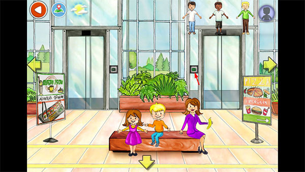 1、第一步,打开娃娃屋plus全新版且全部解锁的游戏,来到电梯口。如同在现实生活里,点击按钮就能让电梯门打开。