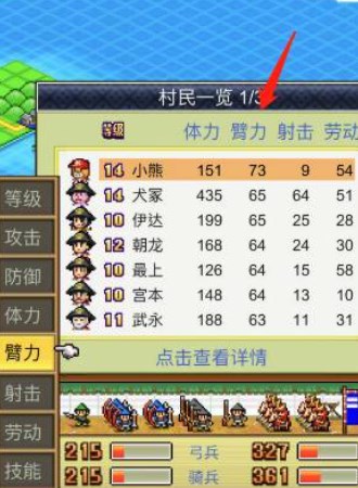 2、玩家需要选择高臂力、技能是连击或者增强攻击的村民进行培养,等级提升到10级可以达到3级技能和150左右的体力。