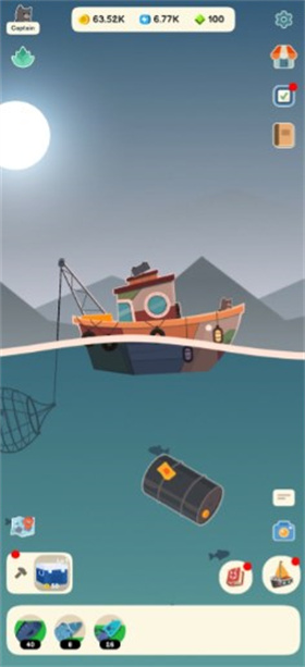 2、为你的渔船和钓竿进行升级,进入到时候的海域之中探索,完成属于你的鱼类收集。
