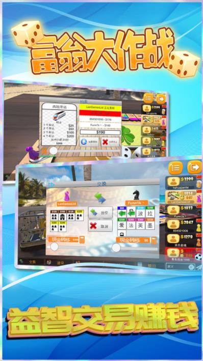 《富翁大作战》是一款支持多人同时在线联机游玩的大富翁类手机游戏。在游戏里,玩家能与其他玩家一同展开冒险,还能够建造专属自己的房屋,这些房屋均可进行资产拍卖。如此一来,该游戏出色地还原了大富翁的经典玩法,为玩家带来更为原汁原味的乐趣。