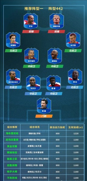 全职荣耀攻守平衡的442阵型可以将每位球员的特点最大化球员组合方面球员组合方面,既有当时名震英超的前锋组合“海布里双枪”博格坎普+亨利,还有“黄金双翼”皮雷斯+永贝里,他们四人一起构成的“前场四重奏”组合足以令所有对手胆寒;后防上,有“不败防线”希曼+坎贝尔+阿什利-科尔+劳伦,再配以维埃拉强悍的防守覆盖能力和图雷的回追能力,进一步为防守加上“后勤保障”组合,硬度与速度兼具,堪称海布里守护神!