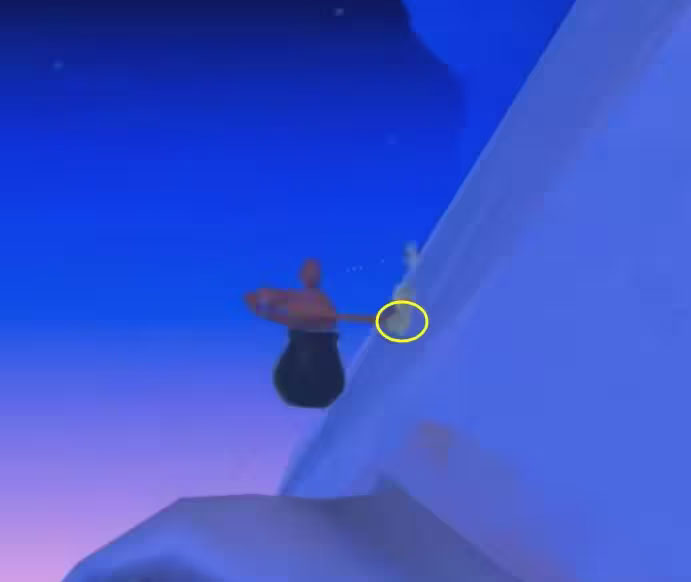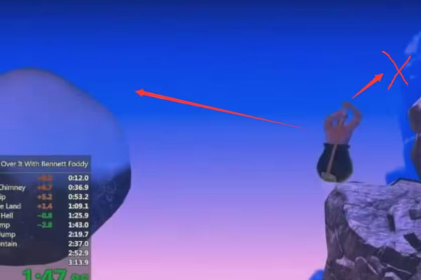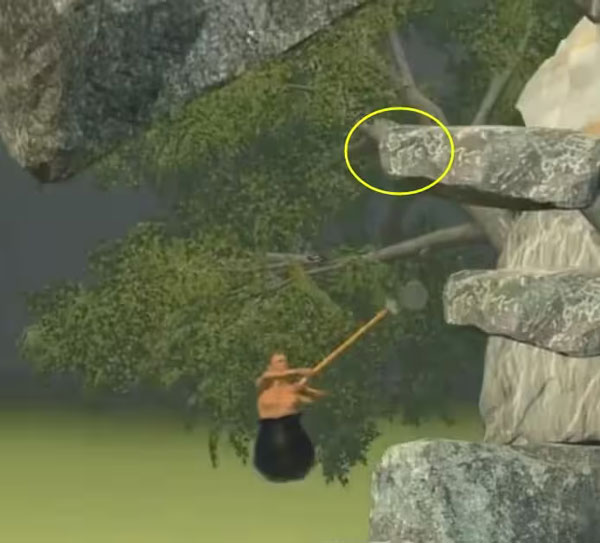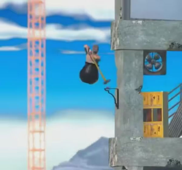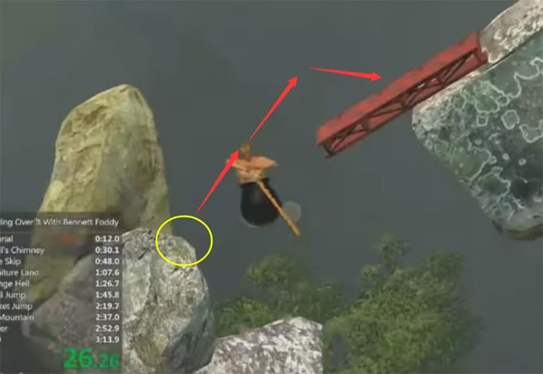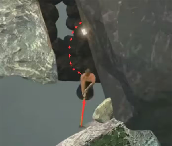 然后就是超级知名的桶了。这个地方超难,需要通过锤子尖刚好勾住桶,通过左右晃动拉动惯性之后荡上去。