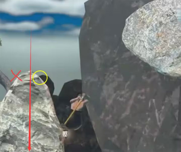12、上来之后的另一个难点,和之前的差不多,但是失败了没事,还能在这个位置继续重来。红色剪头起手,锤子能勾到黄圈就行了,勾到之后别乱动,慢慢的慢慢的拉上去。