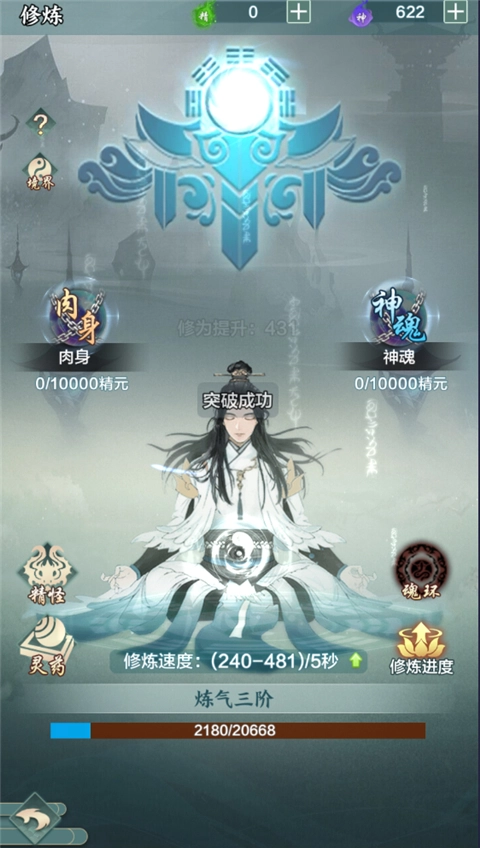 3、在洞府中点击修炼可以看见角色的修炼进度,当修炼满后可以突破;