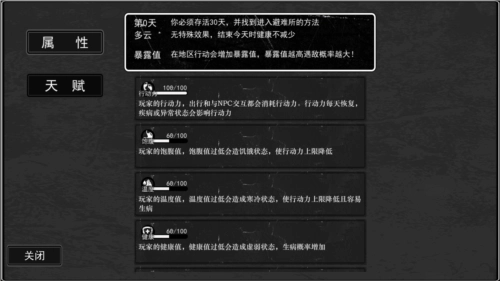这局体验更畅快些,华子加成50%,出门卖掉就能拿到一千五,买零件升级装备,回去直接就凑齐全套了,加上力大无穷的状态直接开杀。第一天满体力全用来搜索,补了点零件和木头,解决两个怪后菜刀、药品和生肉就到手了,后面基本随便玩。可惜医院和工厂只有一天能进,这点挺难受的。二级、三级的怪好打还掉得多,到监狱的四级怪基本得连打三个,对行动力要求很高。食物和健康基本不用操心,但温度问题既得耗行动力找木头和煤,又要花行动力做燃料,属于双倍消耗,哪来那么多行动力折腾啊。