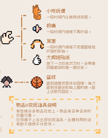 午休时间到啦,玩家将化身为幼儿园老师,担起哄孩子们午睡的重任。一位老师要同时安抚好几个调皮又可爱的萌娃,这可绝非易事。关卡难度会逐步提升,玩家既能借助各类道具来助力,也能亲自出马安抚孩子们。
