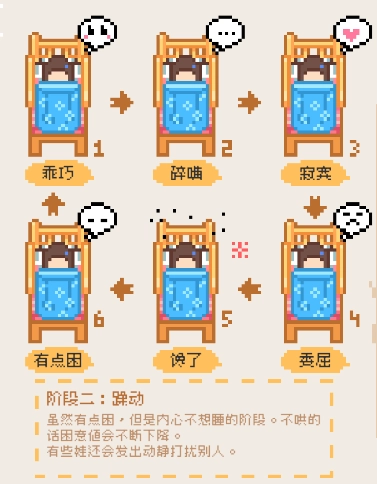 虽然感觉有些困倦,但心里却不想入睡的状态。要是没人哄着,困意就会一点点减退。还有些孩子会弄出声响来打扰其他人。