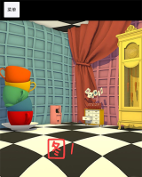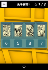 拿完钥匙后,来到图四。那本巨大的书的左下角有个黄色的门,先用闹钟吵醒把手再打开门。开门之后就是找兔子的游戏。