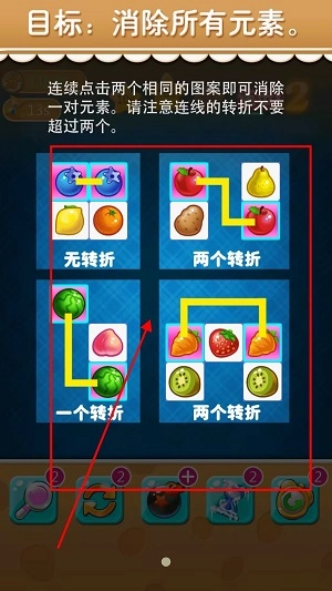 1、核心机制保留经典连连看规则,需要找出相同果蔬并用不超过三条直线连接,路径不能穿过其他卡片。