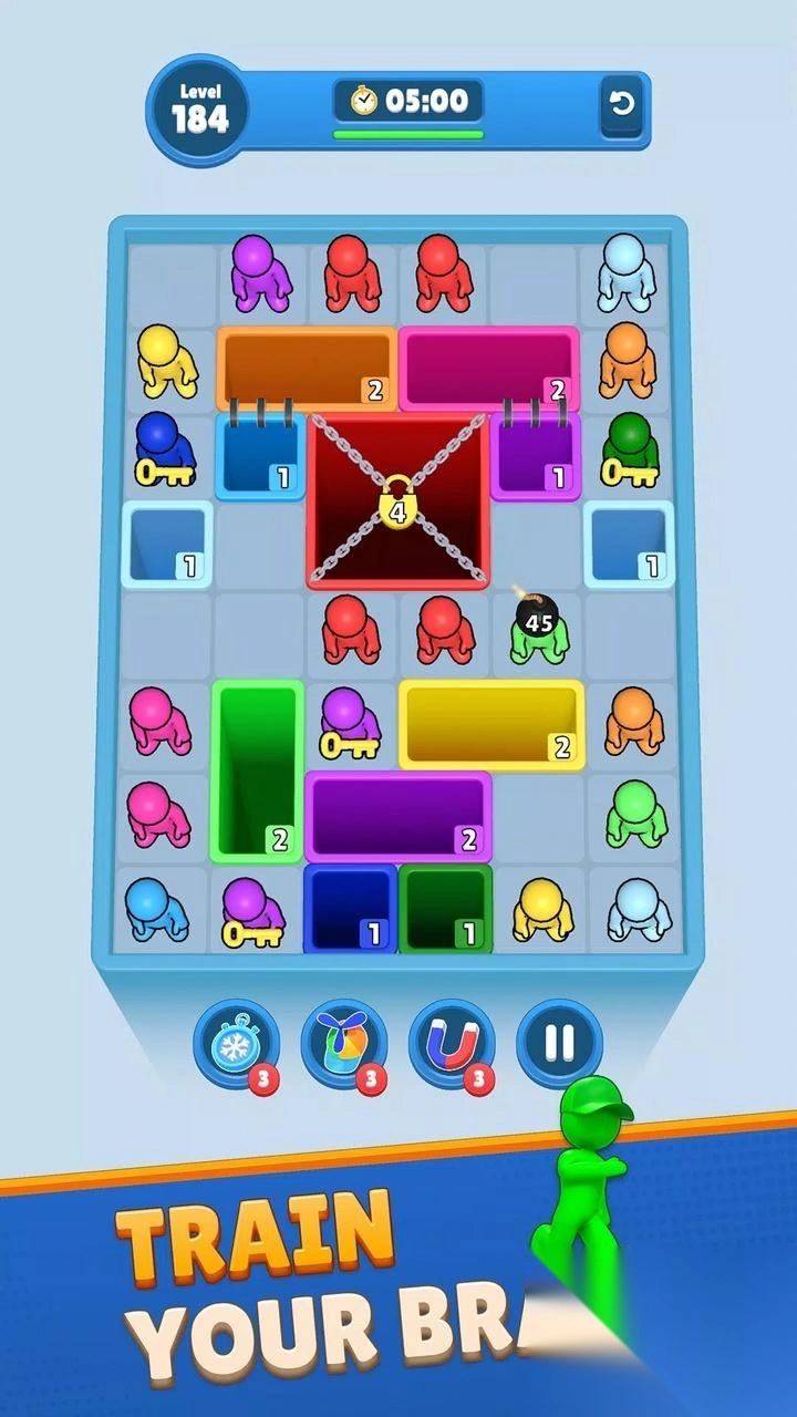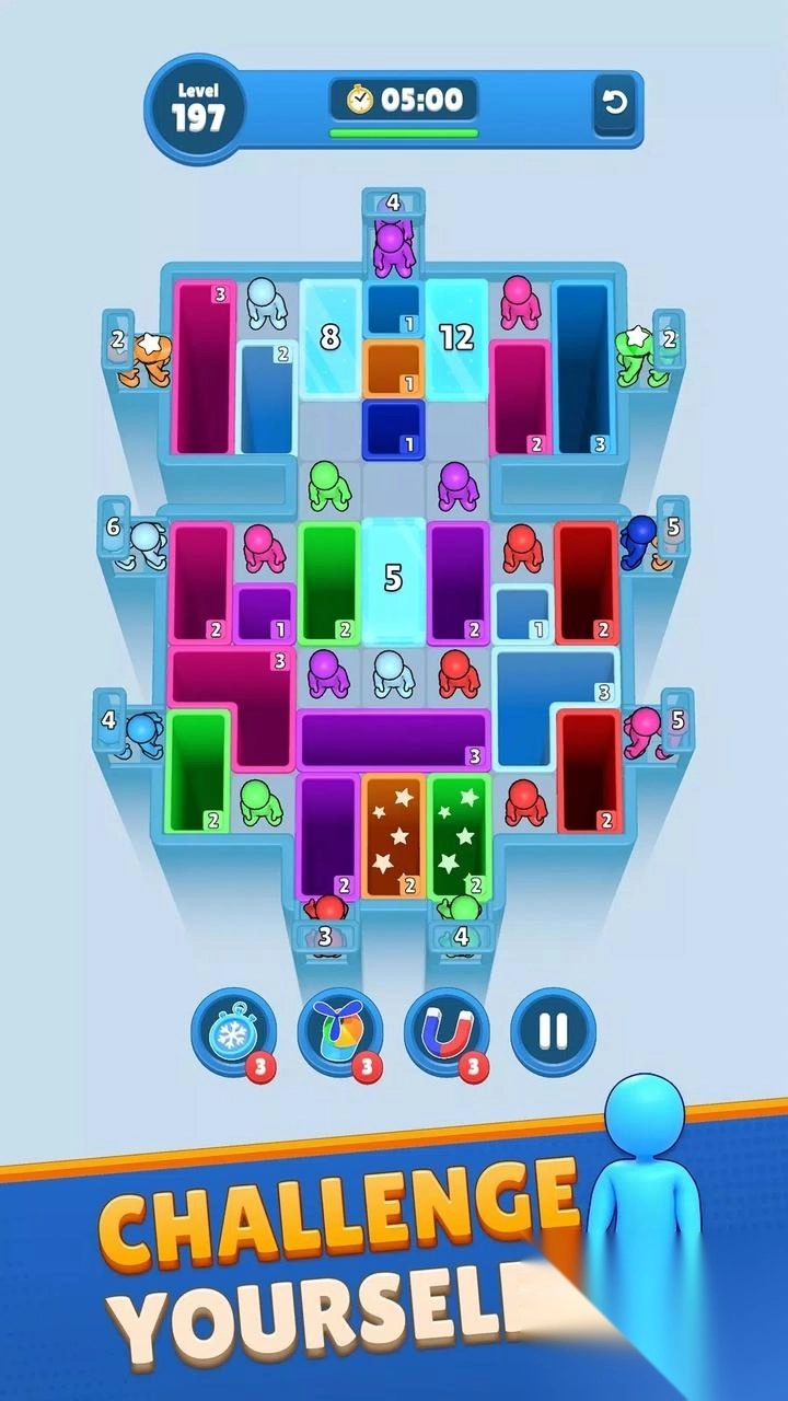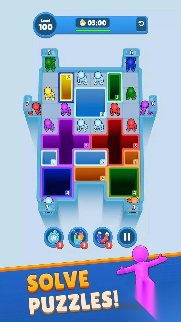 1. 玩家操控可移动的方块空洞,引导各色火柴人精准落入对应颜色区域以完成消除。