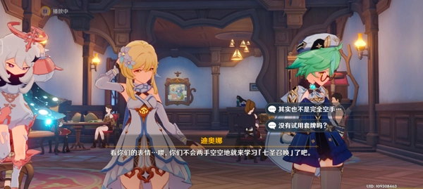 1、打开原神日服后,若想体验原神七圣召唤玩法,首先需要完成前置任务“骰子、猫与卡牌的战场”;