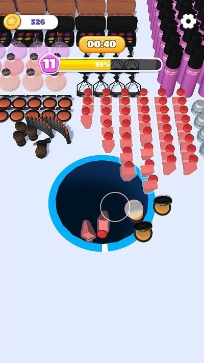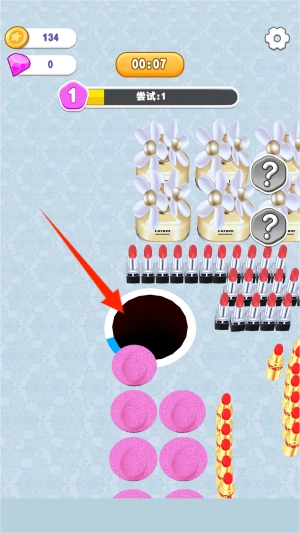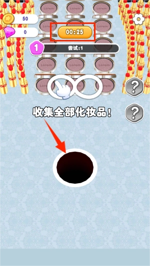 2、可以通过拖动黑洞去吞噬尽可能多的化妆品。