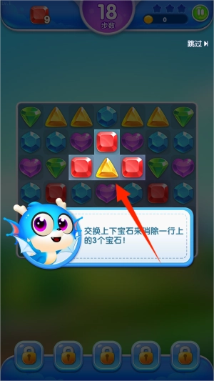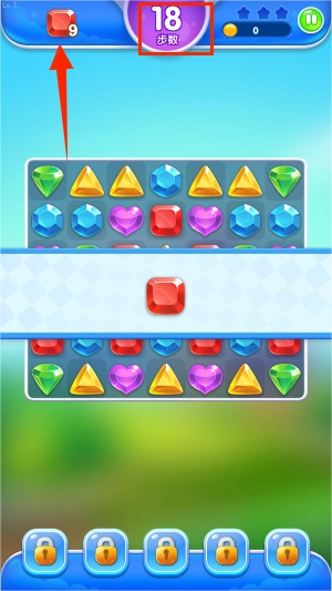 1、进入关卡,你需要在18步之内消除9个红色宝石。