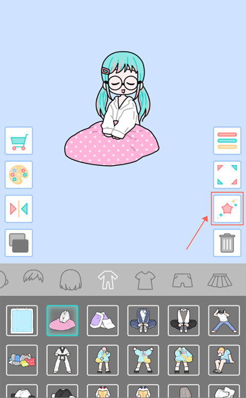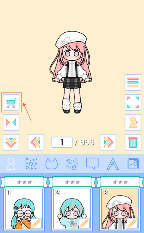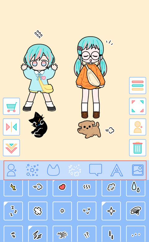 4、进到页面先点击下方的已经搭配好的女鹅将她放到屏幕上,再次点击下方的女孩可以添加多个角色到屏幕中。长按可拖动角色,往下滑至垃圾桶按钮可