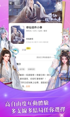 趣穿书是一款为你量身打造的沉浸式互动文字冒险产品,带你开启全新的阅读体验!在这个拥有无限可能的故事世界里,你可以化身为古代仗剑走天涯的侠女、都市职场中雷厉风行的白领、奇幻世界里神秘强大的魔法骑士,也可以成为星际间惊险逃亡的冒险者。不管你喜欢古风仙侠的飘逸洒脱、现代爱情的浪漫温馨、奇幻冒险的惊险刺激,还是偏爱甜宠的甜蜜、悬疑推理的烧脑,平台都准备了各种各样的剧本,让你尽情探索。