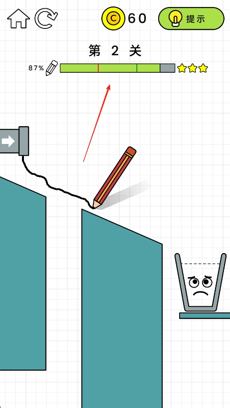 3、持续调整线条,使水流顺利流入水杯,注意绘制线条的长度和角度,达到较高的关卡评分三星通关。