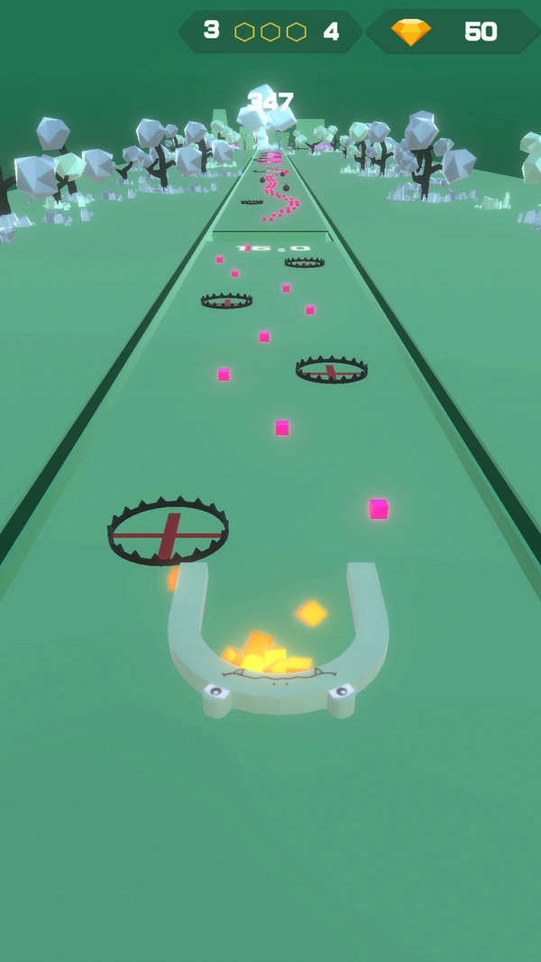 3、控制磁铁左右的摆动躲避障碍物的同时将所有的立方体都收入囊中。