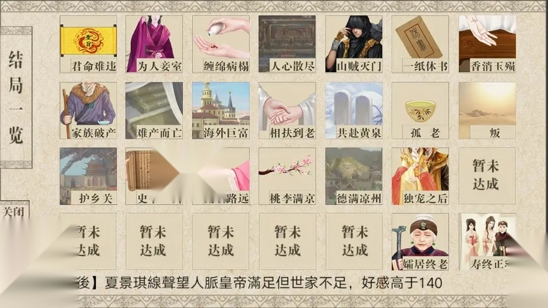 其他结局的达成情况是:当上述某些条件未满足时,比如三皇子的好感度不足、人脉值不够,就会触发这类结局。若想查看结局条件,可按以下步骤操作:在主页面点击“结局一览”,接着点击那些显示“暂未达成”的结局选项,此时界面最下方会出现一行说明文字,从中即可了解该结局的具体达成条件。