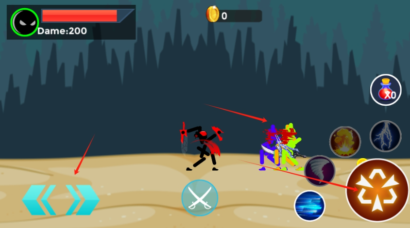 1、玩家操控火柴人角色,在不同关卡与竞技场里和敌人展开激烈对决,借助拳脚、武器与技能完成连击攻击;