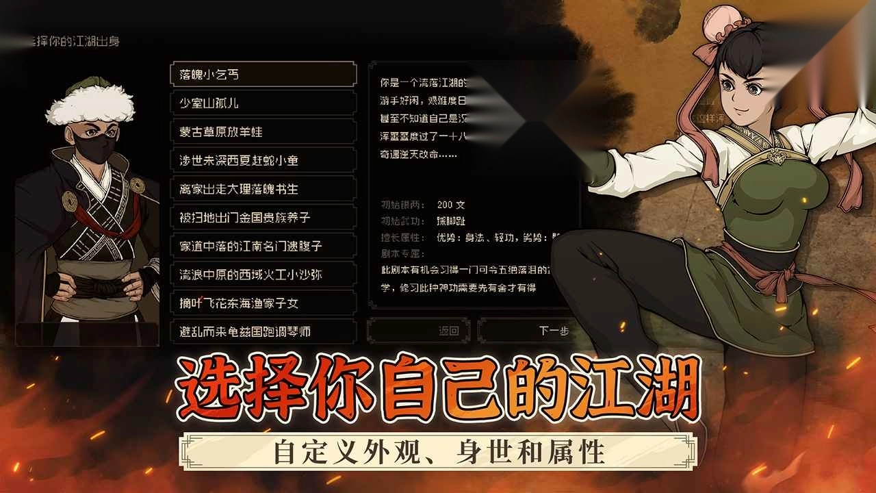 2、通过探索支线任务或挑战隐藏BOSS获取强力武学,开局也可选择“江湖黑手”(背后攻击必暴击)、“酒里乾坤”(醉酒流派核心)等特性,将直接影响战斗风格。