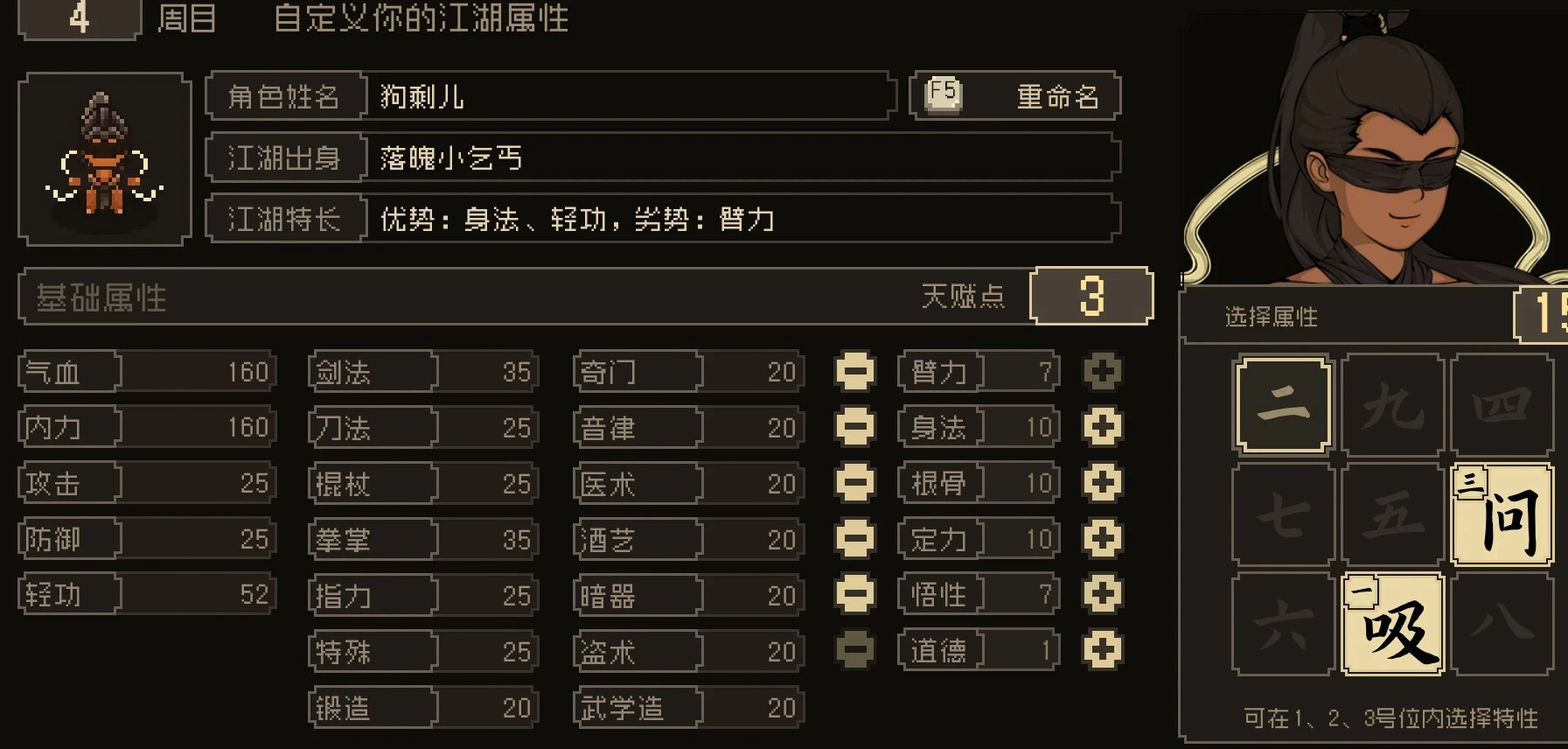 人物如图,推荐落魄乞丐,其它也可,可以加点成这样,道德+到5