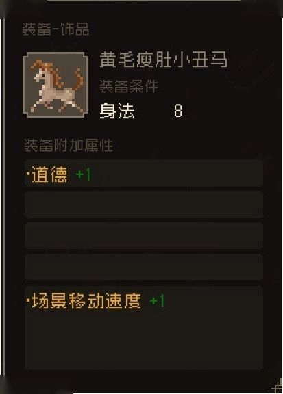 击败李大路后,你将获得三匹马的选择机会。前两匹具备相当实用的属性,第三匹“小丑马”则拥有场景移速翻倍的特殊效果——只要有队友装备它,这个增益就能立即生效,大幅节省跑图的时间成本。这三匹马的取舍,请根据自身需求决定。 另外,战胜车夫同志后,若你的道德值≥10,不仅能将他纳入队伍,还可获得《少林心法》(佛家根基)。由此可见,道德值较低的情况下,基本难以获取佛家根基相关的内容。