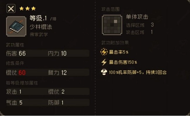 少林棍法 棍仗伤害+5,气血+5%,防御+5%