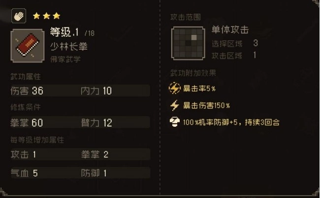 少林长拳 拳掌伤害+5,气血+5%,防御+5%