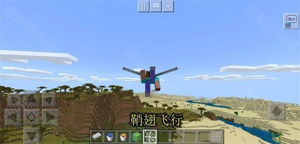 3、调整好方向,装备鞘翅后就可以从平地上起飞了。