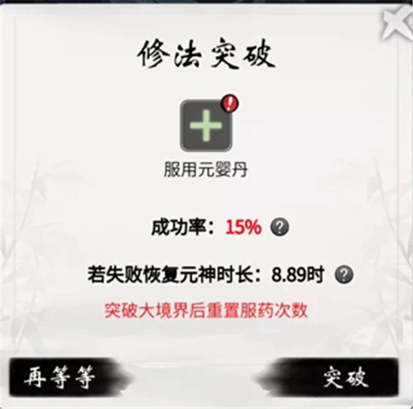 除了服用自己炼制的紫色品质及以上丹药外,还能通过转换修炼方向实现突破,或是刷新天机阁购买修为福袋——也就是双修。前十个境界的升级难度较低,通常能支持刷新十次天机阁。