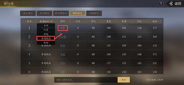1、先去排行榜筛选出普通城池的将,选择一位名将对其进行寻访。