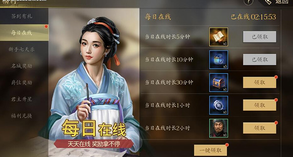 3、点击每日在线领取时长奖励,在线的时间越长奖励越多,点击一键领取就可以了