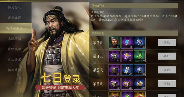 4、点击新手七天乐,按照登陆天数领取对应奖励