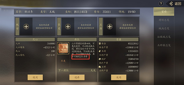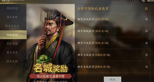 5、名城奖励,玩家一般拥有的县城和君城截止多得到的奖励截止多,最多可以得到200礼金