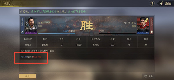 5、在战报里面我们可以看到将领每被击败一次就降低了5点忠诚度,当忠诚度低于50则有概率被抓捕(ps:普通将和没升星的将必定掉5点忠诚,已经升星的名将则有概率掉5点忠诚。并且在野地和除县城外npc城池里面的将领在土地被攻占后会随机逃跑到同州区域)