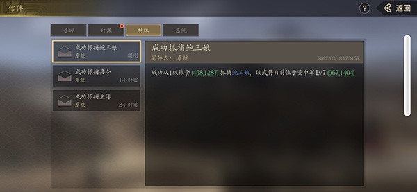 6、完成以上步骤以后,我们会在信件里看到成功抓捕鲍三娘的信息。将领俘虏后会出现攻占队伍的出发城里,这时我们可以回城使用“宝珠”(宝珠可以通过商城购买、采集、活动获得)对将领进行招降,并提高他们的忠诚度。