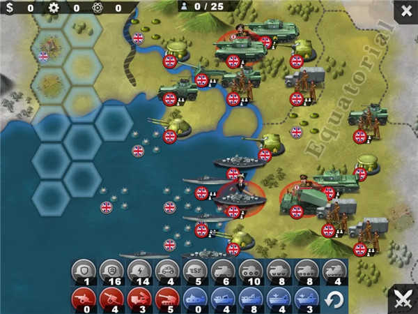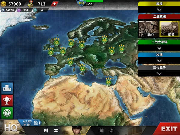 剧本内容围绕战役展开,共分为教程、二战欧洲、二战太平洋、冷战、现代战争这几个板块。其中二战板块细分为轴心与同盟两大阵营:二战欧洲部分里,轴心阵营有11关,主要对应德国和意大利;同盟阵营同样11关,涉及苏联、英国与美国。二战太平洋部分中,轴心阵营9关以日本为主,同盟阵营9关则对应美国。冷战板块分为华约和北约阵营,双方各有6关。现代战争的剧情是联合国军队对抗恐怖组织,目前仅开放联合国阵营的9关,且这些关卡基本涵盖了世界主要大国。